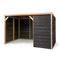 Der Stall ist auf einem Rahmen aus behandeltem Kiefernholz errichtet und für den langfristigen Einsatz im Freien konzipiert. Die Außenfassade ist mit schwarzem Holz verkleidet und mit Details aus Douglasienholz verziert, was für ein stilvolles und langlebiges Erscheinungsbild sorgt.
